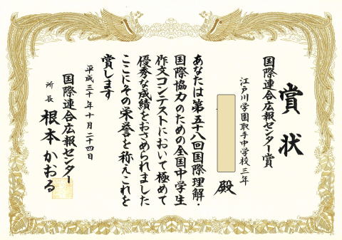 本校生徒が、外務省 と 公益財団法人日本国際連合協会 が主催した、第58回 国際理解・国際協力のための全国中学生作文コンテストに参加し、「国際連合広報センター賞」を受賞致しました。