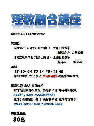 | 2.実 施 日 | 平成29年7月22日(土曜日)土曜日授業E 13:30 〜 15:45 東大ジュニアコース 「数学」13:30 〜 14:30 → 「理科」14:45 〜 15:45 医科ジュニアコース 「理科」13:30 〜 14:30 → 「数学」14:45 〜 15:45 ※ 原則2時間連続の講義となります。 |